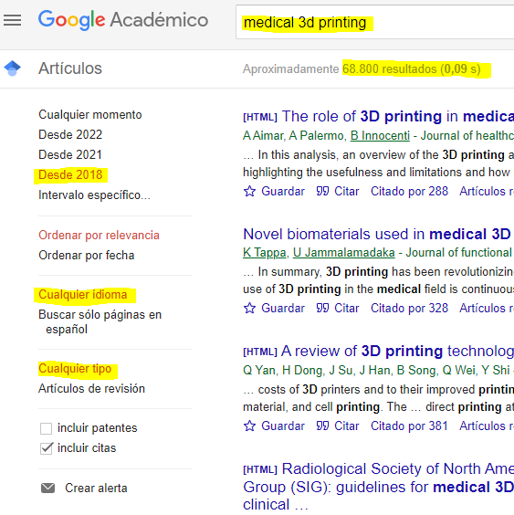 Posteriormente hice una variación en los parámetros de búsqueda, basándome en los dos últimos años ya que la impresión 3D ha impactado en estos y arrojo los resultados presentes y marcados en color amarillo de la figura 2.